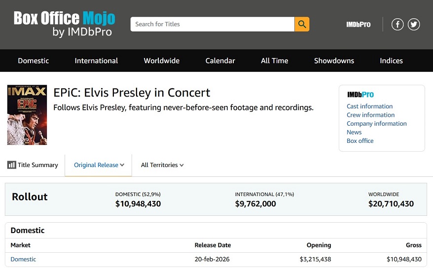 Si au Rex le 6 mars, il était annoncé qu’EPiC avait déjà engrangé plus de 16 millions de dollars dans le monde, à présent, après trois semaines d’exploitation, le succès internationale d’EPiC, comme le montre les chiffres publiés le 9 mars, ne se dément pas. Selon les magazines spécialisés, les recettes mondiales : 20,858,000 $, sont réellement impressionnantes pour un documentaire musical. Comparaison est faite avec le documentaire réalisé par Ron Howard : The Beatles: Eight Days a Week -The Touring Years qui avait finalement rapporté 12,3 millions de dollars dans le monde. Au Royaume-Uni, lors de son premier week-end d'exploitation nationale, la presse soulignait qu’EPiC se classait deuxième au Box-office, derrière Les Hauts de Hurlevent de Emerald Fennell avec Jacob Elordi (Elvis dans le film Priscilla) film qui était diffusé dans 120 salles de plus.