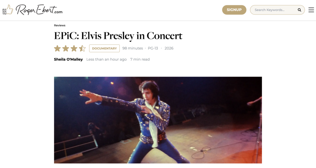 Alors que les nouveaux films « Wuthering Heights » et « GOAT » se battent pour la première place, « EPiC : Elvis Presley in Concert » reçoit une mention soignée. « New Elvis Presley Concert Pic Wows » même s’il n’est toujours diffusé que sur les écrans IMAX aux États-Unis.