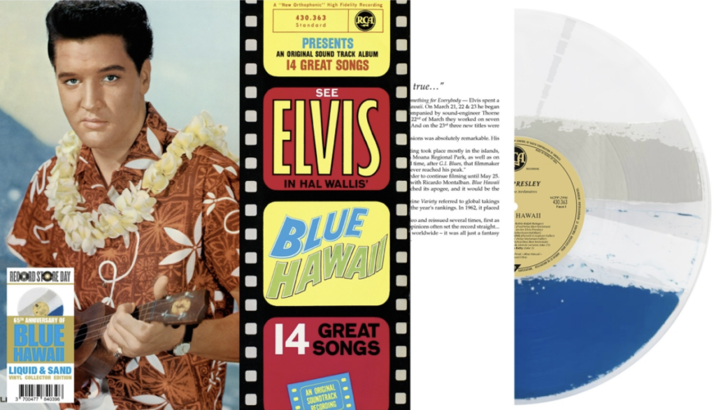 L’originalité de cette nouvelle édition réside principalement dans le fait que le vinyle renferme non seulement ; un fluide bleu, mais aussi du sable, histoire de se souvenir de la plage d’Honolulu. Le LP propose, en bonus, trois versions alternatives de : Can’t Help Falling in Love, Rock-A-Hula Baby etBeach Boy Blues, ainsi que Steppin’ Out of Line, qu’Elvis a enregistré en deux versions distinctes. Curieusement, aucune de ces deux versions ne figure sur l’album original ni dans le film, malgré dix-neuf prises. La première version, dite « version film », dont le master est un assemblage de la prise 8 et de la fin de la prise 19, n’est sortie qu’en 1997, sur une édition spéciale de l’album Blue Hawaii(66959-2). La « version disque », prise 9, était parue en juin 1962 sur l’album Pot Luck (LSP 2523). La version CD inclut en bonus onze prises alternatives des titres du LP original.