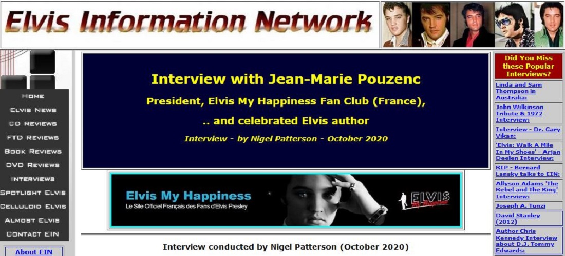 Au mois d’octobre, notre Président a été interview par Nigel Peterson pour le site bien connu des fans d’Elvis, EIN – www.elvisinfonet.com – montrant ainsi une fois de plus la place essentielle tenue dans le monde du King par Elvis My Happiness.