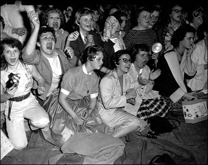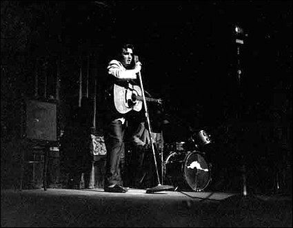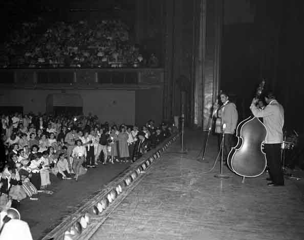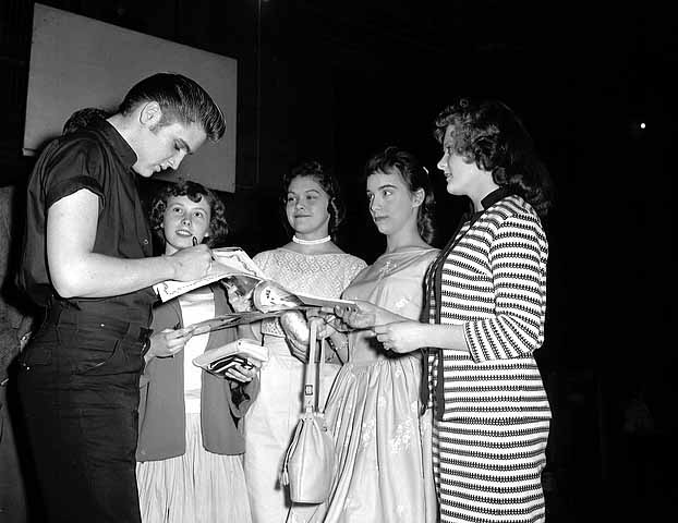 Au fil du temps, Elvis fut pris d’un trac terrible. Il arpentait la salle, tremblant. Ses mains étaient glacées et il s’appuyait parfois contre un mur ou une personne, selon ce qui lui tombait sous la main. Une fois sur scène, Elvis prit une pose théâtrale comme à son habitude, frappa sur sa vieille guitare, tapa du pied et lança : Now since ma baby left me… À ces mots, les filles se précipitèrent vers la scène en hurlant frénétiquement. La police tenta de les retenir. Les hurlements continuèrent pendant tout le spectacle… Personne ne semblait se soucier du fait qu’on ne l’entende pas. Le voir suffisait. Après une demi-heure de concert, il quitta la scène en trombe, épuisé. Plus tard, alors qu’il montait dans sa voiture pour partir, des centaines de filles l’ont acclamé, et Elvis Presley s’est éloigné, laissant derrière lui une foule de souvenirs heureux