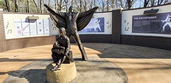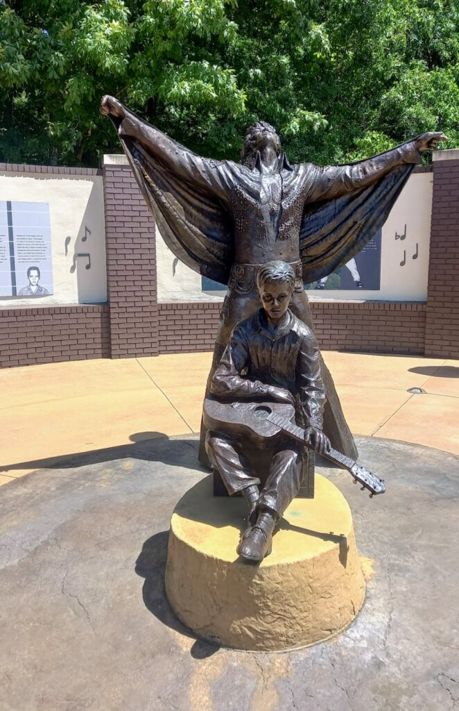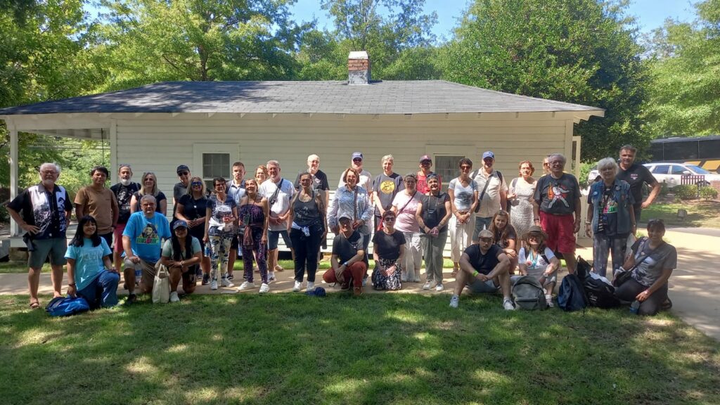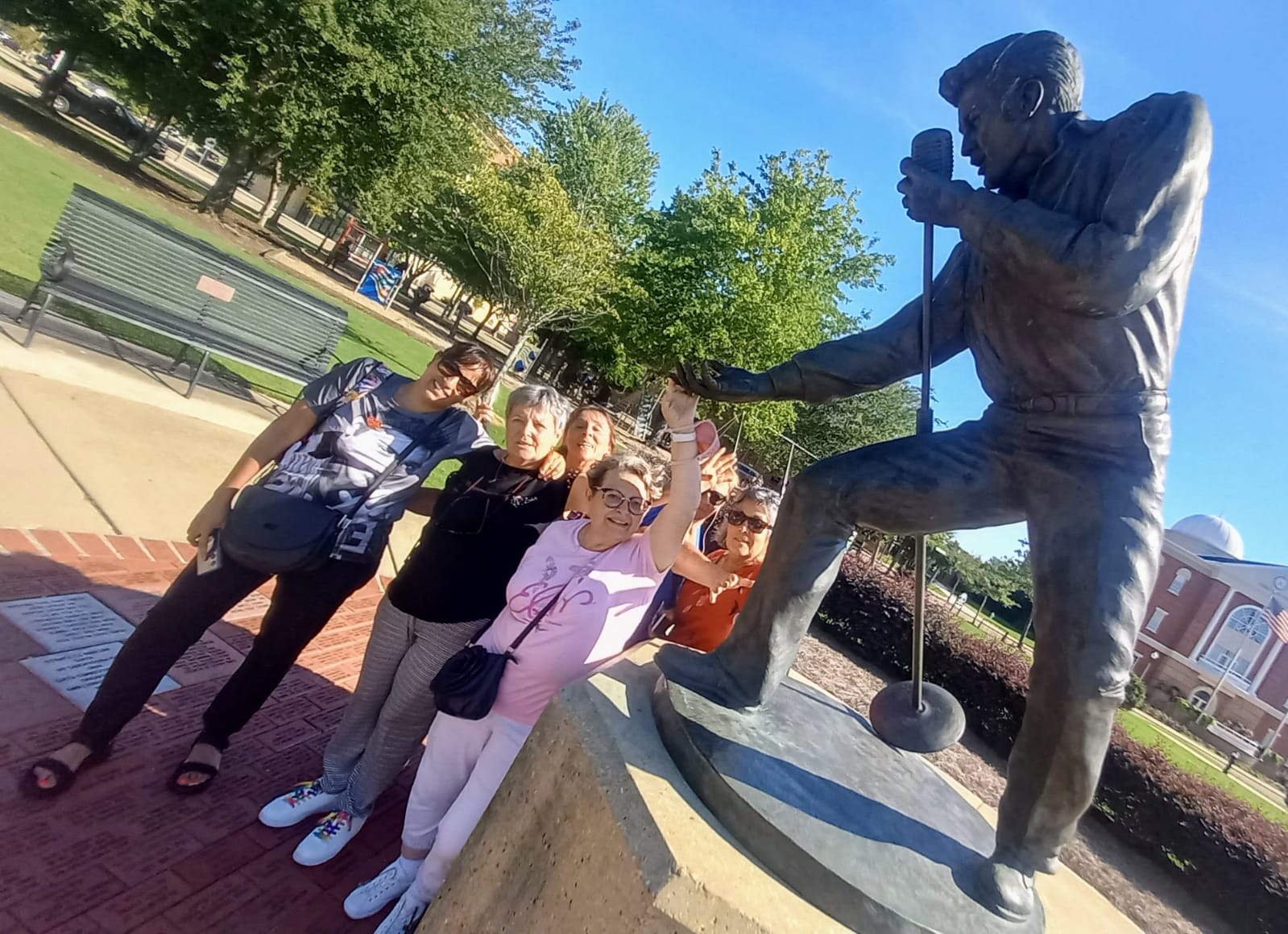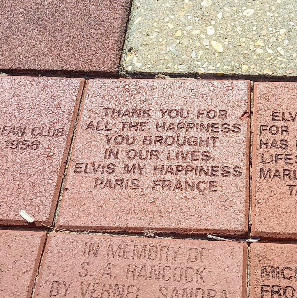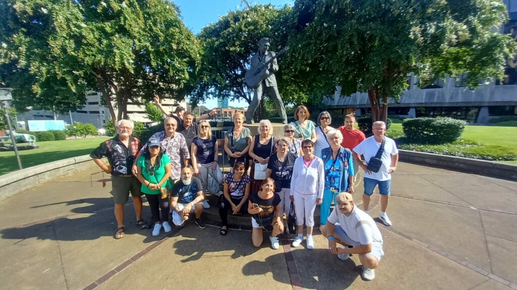Samedi 13 août. Journée Tupelo. Visite par le groupe de la maison natale d’Elvis, de la chapel, du musée, des statues… du Fairpark District où se trouve la statue du King commémorant les mythiques shows de septembre 1956 et où se trouve une brique sur laquelle on note la participation d’Elvis My Happiness à l’édification du lieu..