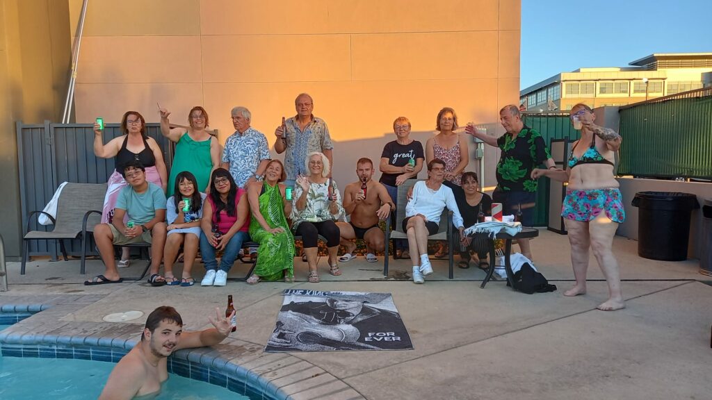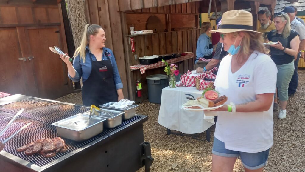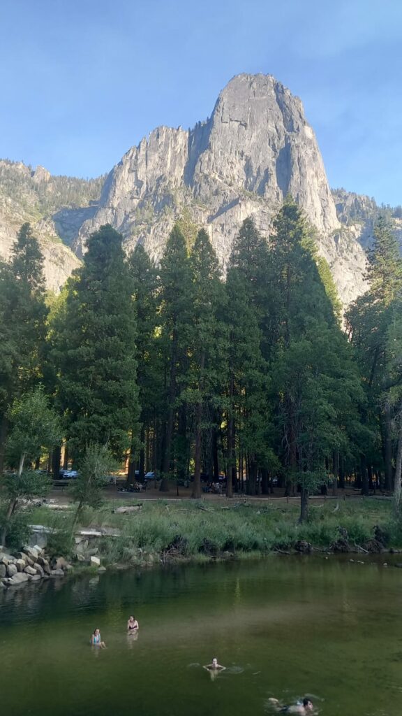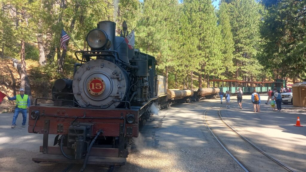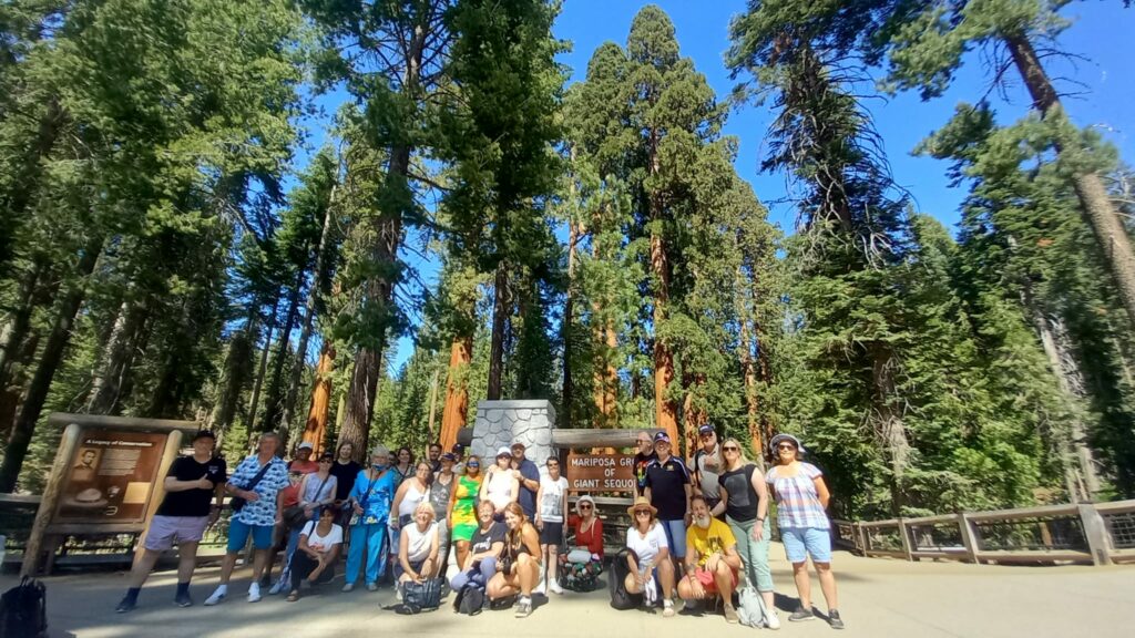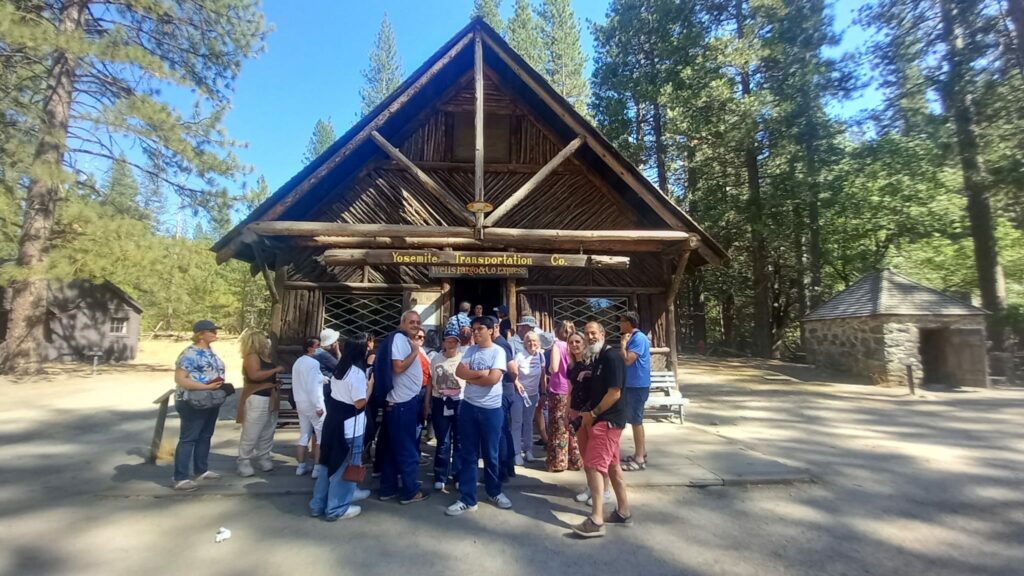 Dimanche 21 août. Cette nuit à l’hôtel La Quinta nous a fait le plus grand bien. Notre visite dans le Yosemite Park se poursuit, dès 9h par un transfert en bus vers la gare qui se situe à quatre miles de l’entrée sud de Yosemite. A 11h, le groupe monte à bord d’un train d’époque avec une locomotive à vapeur et part en excursion sur le chemin de fer Yosemite Mountain Sugar Pine Railroad. C’est un coin pittoresque de la magnifique Sierra National Forest. Bonne surprise pour le groupe le déjeuner autour d’un BBQ est offert par Elvis My Happiness… Celui-ci terminé nous partons en randonnée à Mariposa aux milieux des arbres géants. La rue principale de la ville rappelle les westerns d’antan et toute la ville est entourée de forêts de pins. Après toutes ces aventures un plongeon/apéro autour de la piscine ne peut pas faire de mal !…