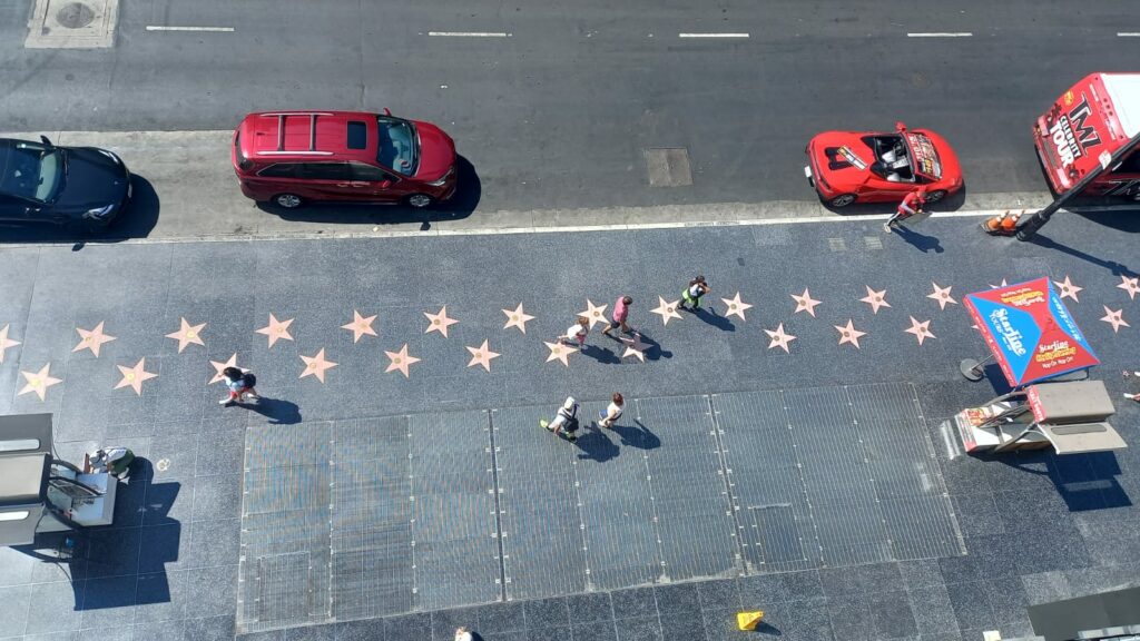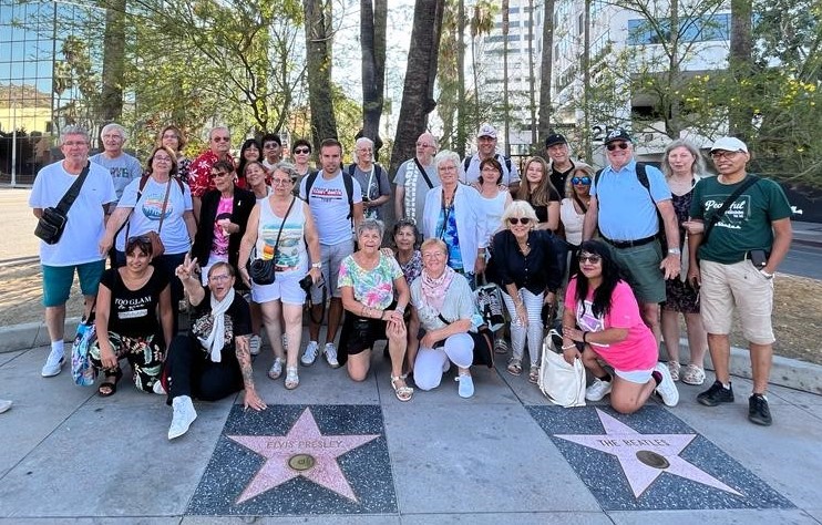 Jeudi 25 août. Nous prenons la route pour Los Angeles via Santa Monica… Comme nous avons pu le constater, là, comme ailleurs, le film Elvis est toujours à l’affiche. Sur Hollywood Boulevard, nous ne manquons pas, bien entendu, de venir rendre hommage au King en posant devant son étoile. Le boulevard s’étend d’Est en Ouest de Vermont Avenue jusqu’à Sunset Boulevard. Outre le Walk of Fame, avec les fameuses étoiles des vedettes, on trouve également le Hollywood and Highland Center où sont remis chaque année les Oscars, mais aussi le Grauman’s Chinese Theatre où il y a peu, Priscilla, Lisa Marie et ses trois filles, ont imprimé leurs mains dans du ciment frais. Nous filons ensuite sur Las Vegas, en opérant toutefois un arrêt à Calico, une ancienne ville minière de l’Ouest bâtie aux alentours de 1880 et devenue une « ville fantôme » peu avant le 20ème siècle. Le contraste avec Las Vegas où nous logeons au Tropicana Resort Casino, est tellement saisissant que cela devient difficilement imaginable et il n’y a pourtant qu’un siècle d’écart.