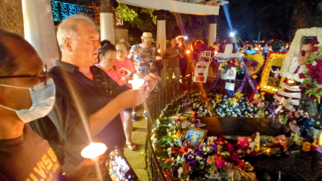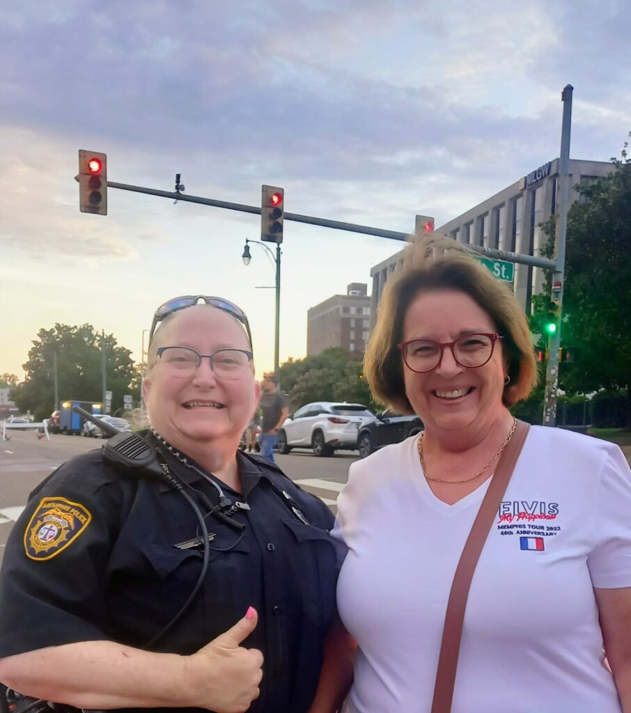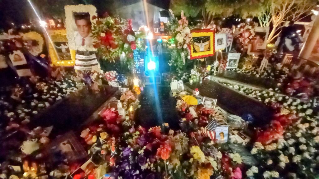 Lundi 15 août. Après trois jours menés au pas de charge et une soirée au Hard Rock Café, une matinée de repos est la bienvenue, d’autant que cette nuit le groupe va assister à la Candelight Vigil. Certains en profitent pour se balader à Beale Street ou se rendre au Peabody… Après un passage au Cowboy Corner, histoire de faire quelques achats… direction Graceland pour ce qui est le moment émotionnel le plus fort de la semaine. Le Boulevard Elvis Presley appartient aux fans qui selon certaines sources seraient près de 25 000 !! Après avoir écouté Priscilla, tous montent ensuite vers le Jardin des Méditations à la rencontre du King. La nuit a été longue..