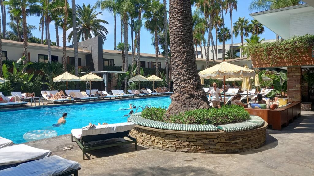 Mercredi 24 août. Aujourd’hui, direction Santa Barbara, ville rendue célèbre dans le monde entier dans les années 80 par la série du même nom – 2137 épisodes du 30 juillet 1984 au 15 janvier 1993. Le choix est laissé, State Street, la plage de Victoria Street avec sa longue jetée sur la mer, la Courthouse… Nous optons pour l’Old Mission pour trouver un peu de silence et de sérénité… Elle témoigne de la tradition franciscaine, pratiquant une hospitalité radicale, dans l’esprit de Saint François. La Mission a servi de lieu de rassemblement depuis sa création en 1786, elle est également le siège de la paroisse Sainte Barbara. Après un arrêt dans un Mall El Paseo, le premier centre commercial de Californie, né dans les années 1920. Nous nous rapprochons ensuite de Los Angeles et passons la nuit au bel hôtel The Palm Garden Thousand Oaks.