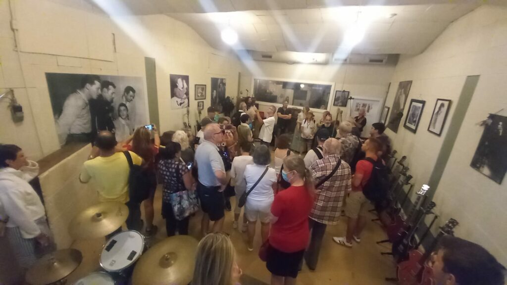 Dimanche 14 août. Journée MEMPHIS « Elvis Style ». Sur les traces du King en démarrant par le Sun Studio, puis l’Humes Hight School, le 1034 Audubon Drive, l’Overton Park (Levitt) Shell, la Statue d’Elvis au Tennessee State Welcome Center… etBeale Street ou notre groupe a terminé la soirée au Hard Rock Café en compagnie de nos amis anglais de Strictly Elvis. La journée a été longue et chargée en souvenirs…