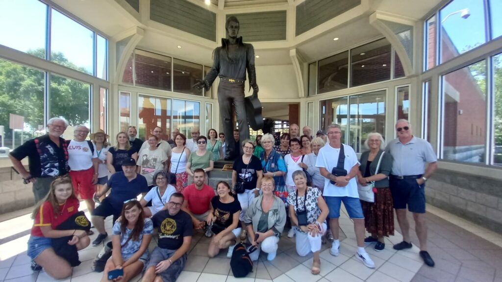 Vendredi 12 août. Notre groupe, sous la houlette de Ulrich Dumerin aidé de Frédéric Antraigue, a débuté, par la visite de Graceland, sa semaine sur les traces du King à Memphis. Merci à tous les participants de si bien représenter notre pays et Elvis My Happiness à cette commémoration du 45ème anniversaire de la disparition d’Elvis. Une semaine qui s’annonce très riche en événements de toutes sortes : visites de Memphis, Tupelo, Concert… Une moisson de souvenirs inoubliables…