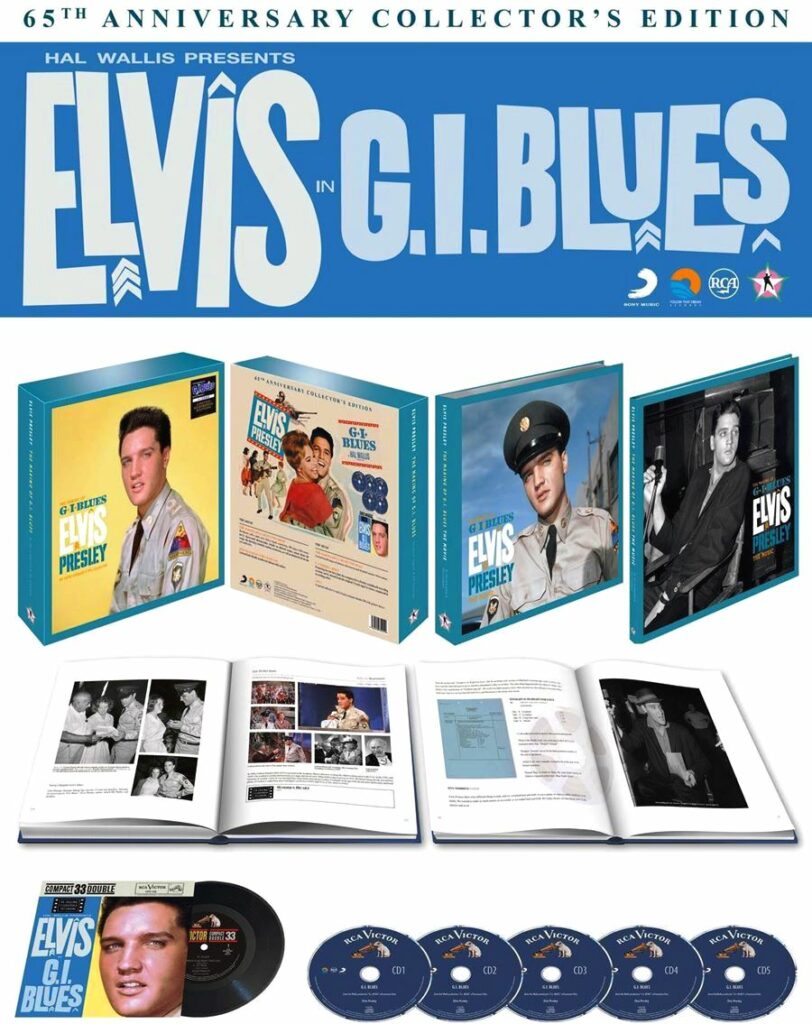 Ce coffret Deluxe absolument remarquable, né de la collaboration de David English et Pål Granlund, vient commémorer le 65ème anniversaire de G.I. Blues. Numéroté individuellement, il comprend deux livres et cinq CD. Le livre 1 – The Making Of G.I. Blues, de style « beau livre », de luxe relié, de 384 pages, propose de nombreuses photographies inédites, des détails sur les scènes coupées, des extraits du scénario, le planning de tournage, des mémos, des contrats, ainsi que des témoignages des acteurs et de l’équipe… Le livre 2 – The Making Of G.I. Blues – La musique – propose, 84 pages de photos, de documents et d’informations détaillées sur les sessions d’enregistrement. Les cinq CD, présente eux, pour la première fois, l’intégralité des sessions d’enregistrement de la bande originale, des bandes originales trois pistes au format stéréo, séquencées dans l’ordre d’enregistrement, mixé et masterisé par Vic Anesini et Sebastian Jeansson. S’ajoute à cela un EP vinyle collector 33 tours, double format compact avec pochette illustrée. Un must absolu !…