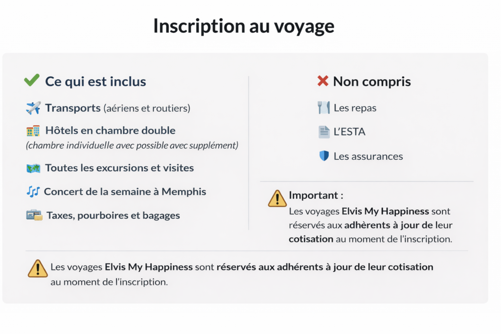 Que ce soit pour un voyage en groupe ou individuel, merci de mettre en copie l’association Elvis My Happiness, auprès de laquelle vous devez être à jour de votre adhésion.